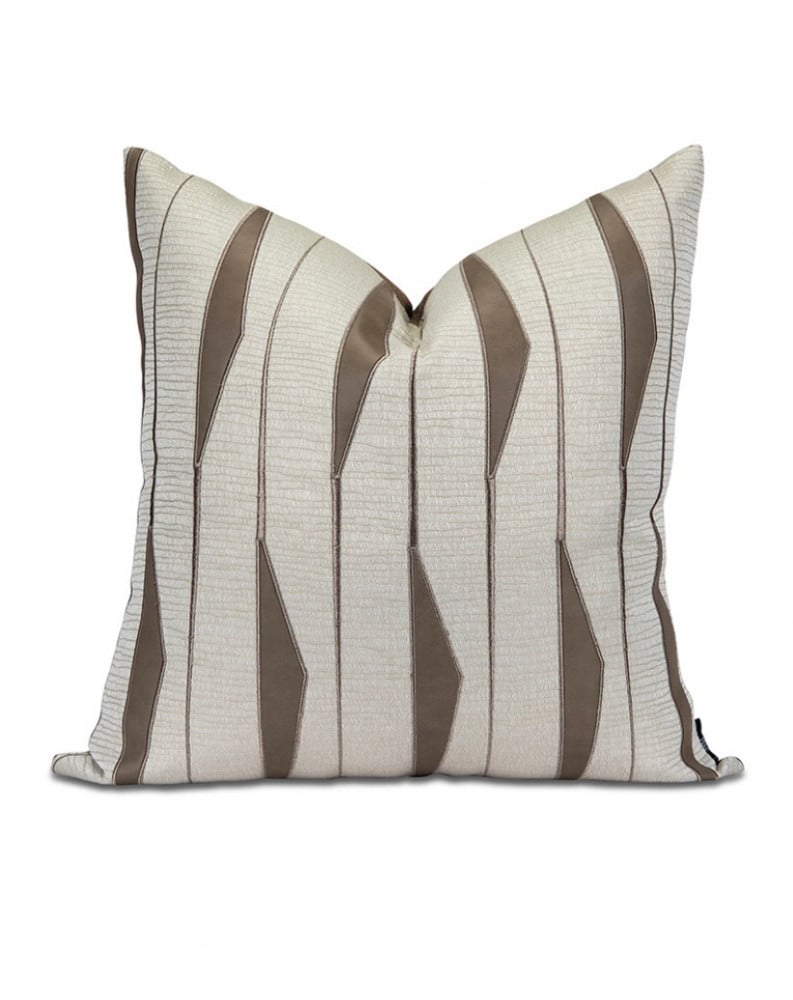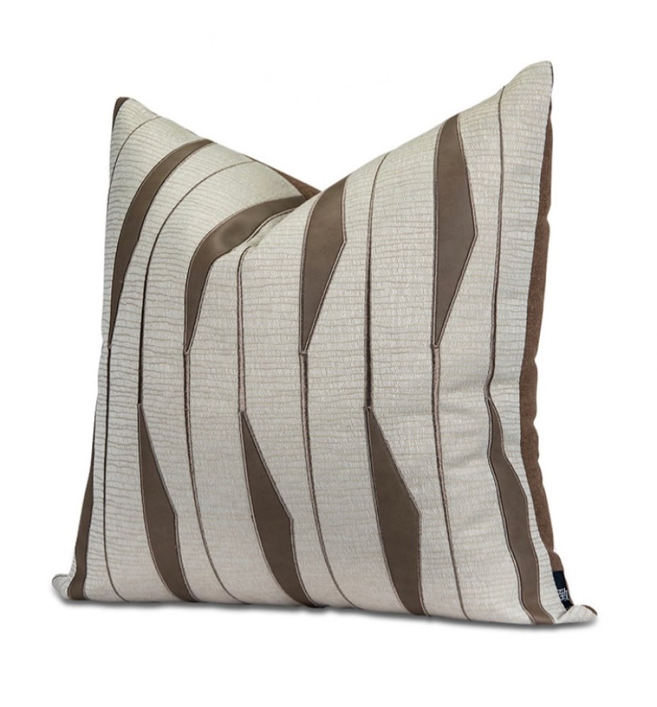 غطاء مخدة أنيق بلون بيج فاتح مع خطوط هندسية متناسقة باللون البني، يعطي إحساس بالنظام والعصرية، ويكمل ديكور أي غرفة بسهولة.